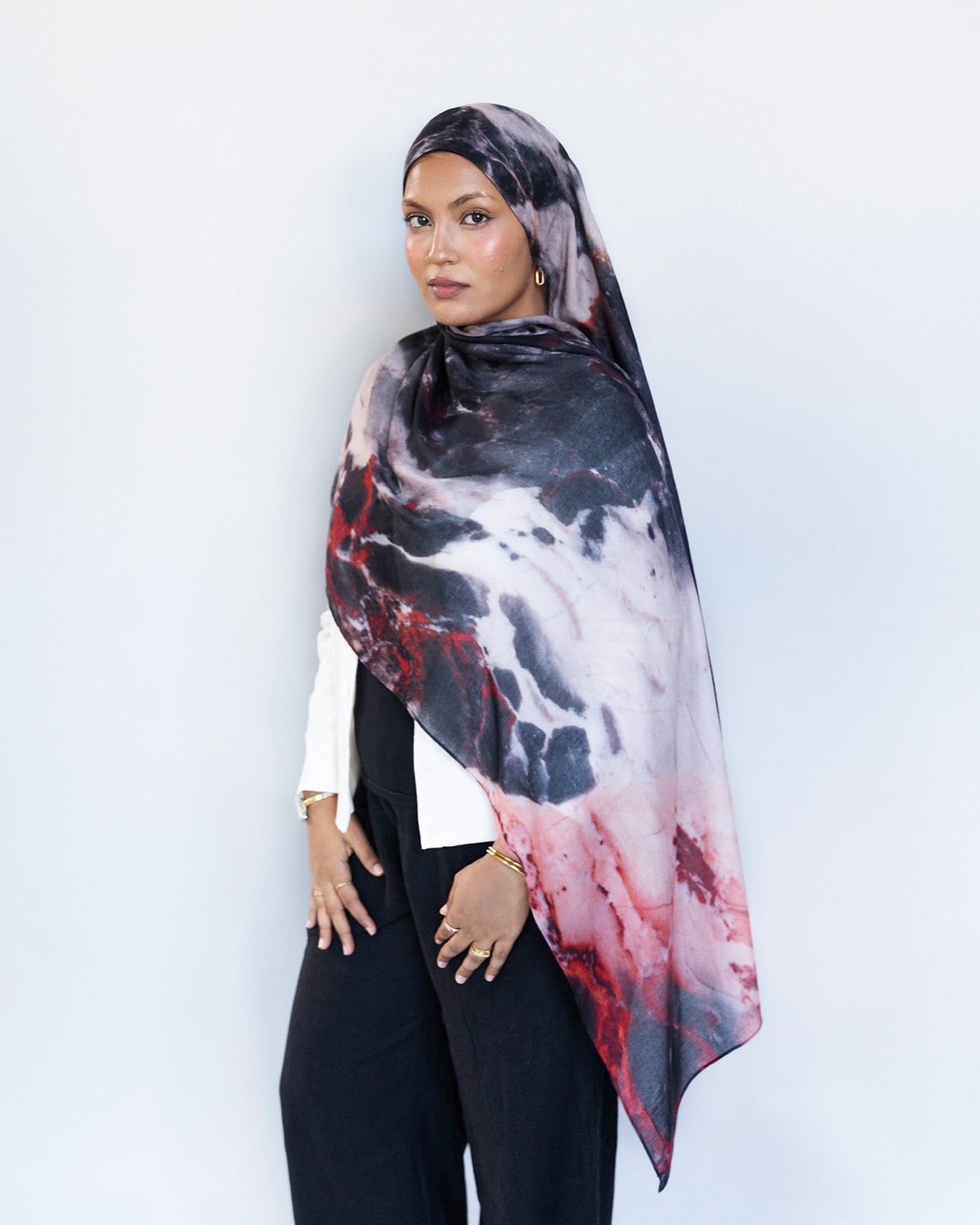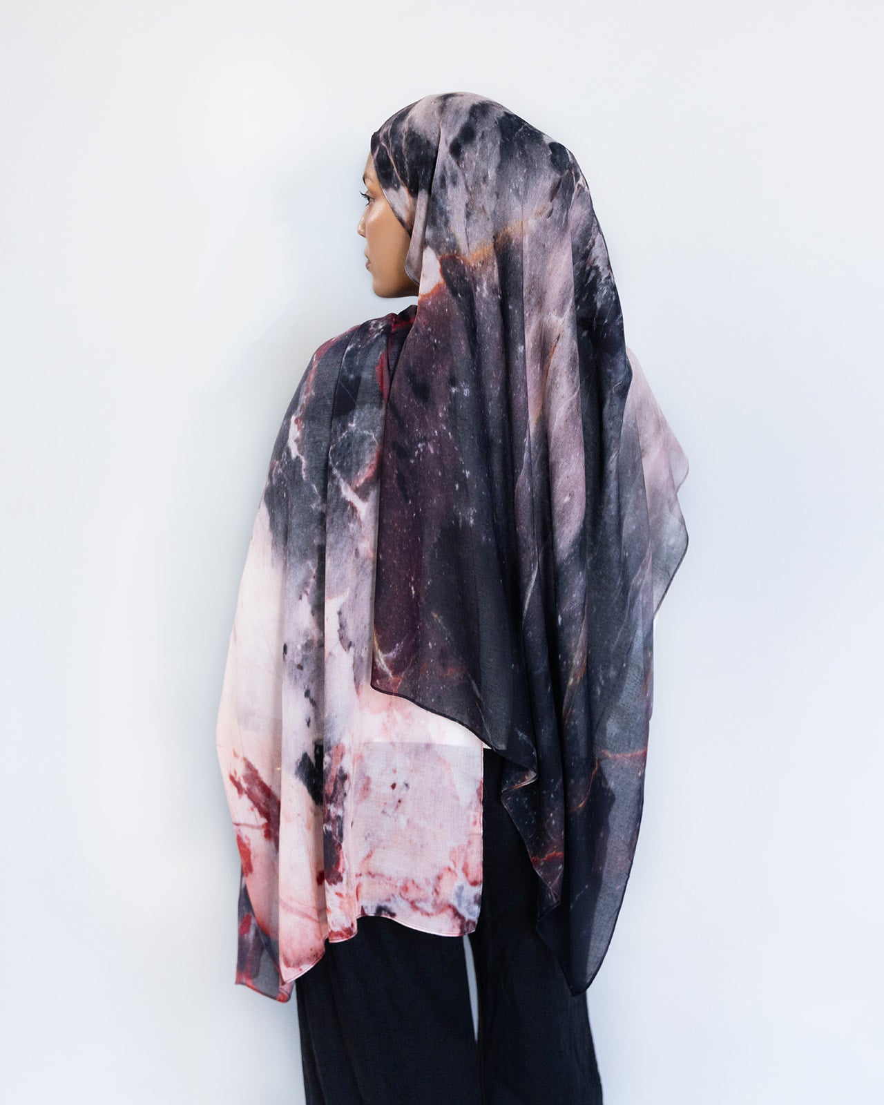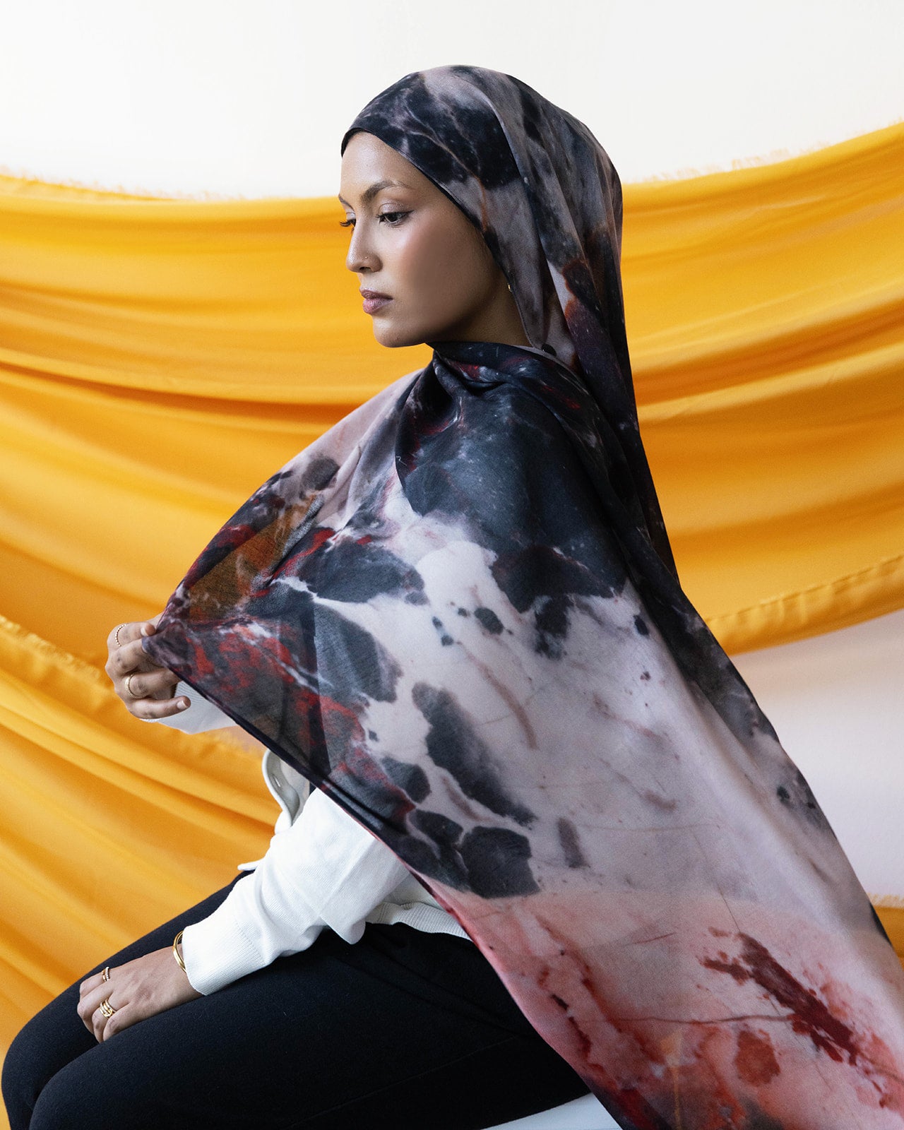 Ashen Rose is elegance with an artistic edge. Crafted from ultra-soft modal fabric, it drapes effortlessly while offering all-day comfort. With a striking mix of black, rose, and ivory tones, this hijab carries both sophistication and bold style. A modest essential that transitions seamlessly from casual wear to evening gatherings with grace.