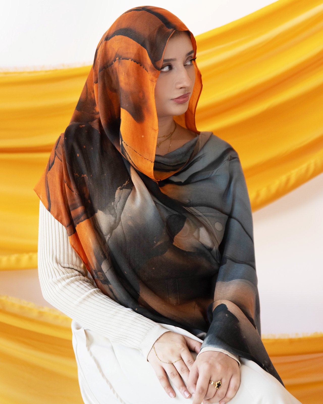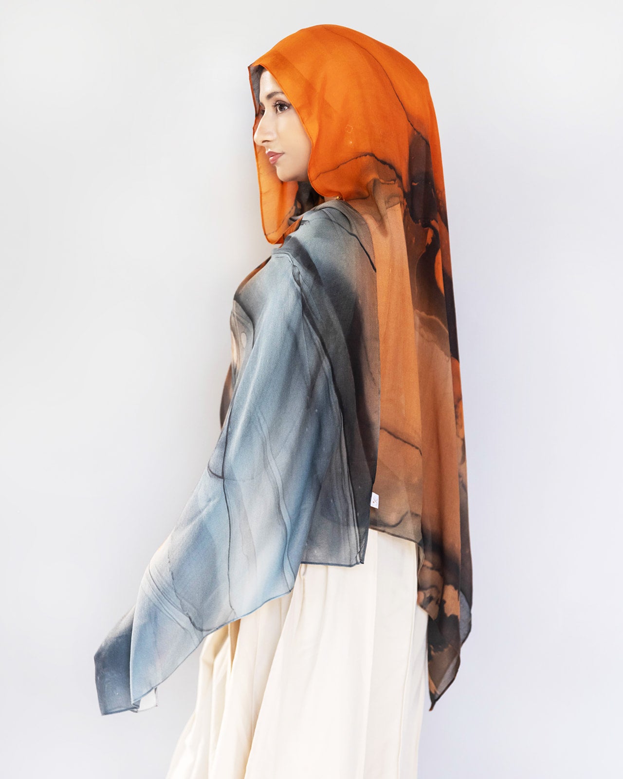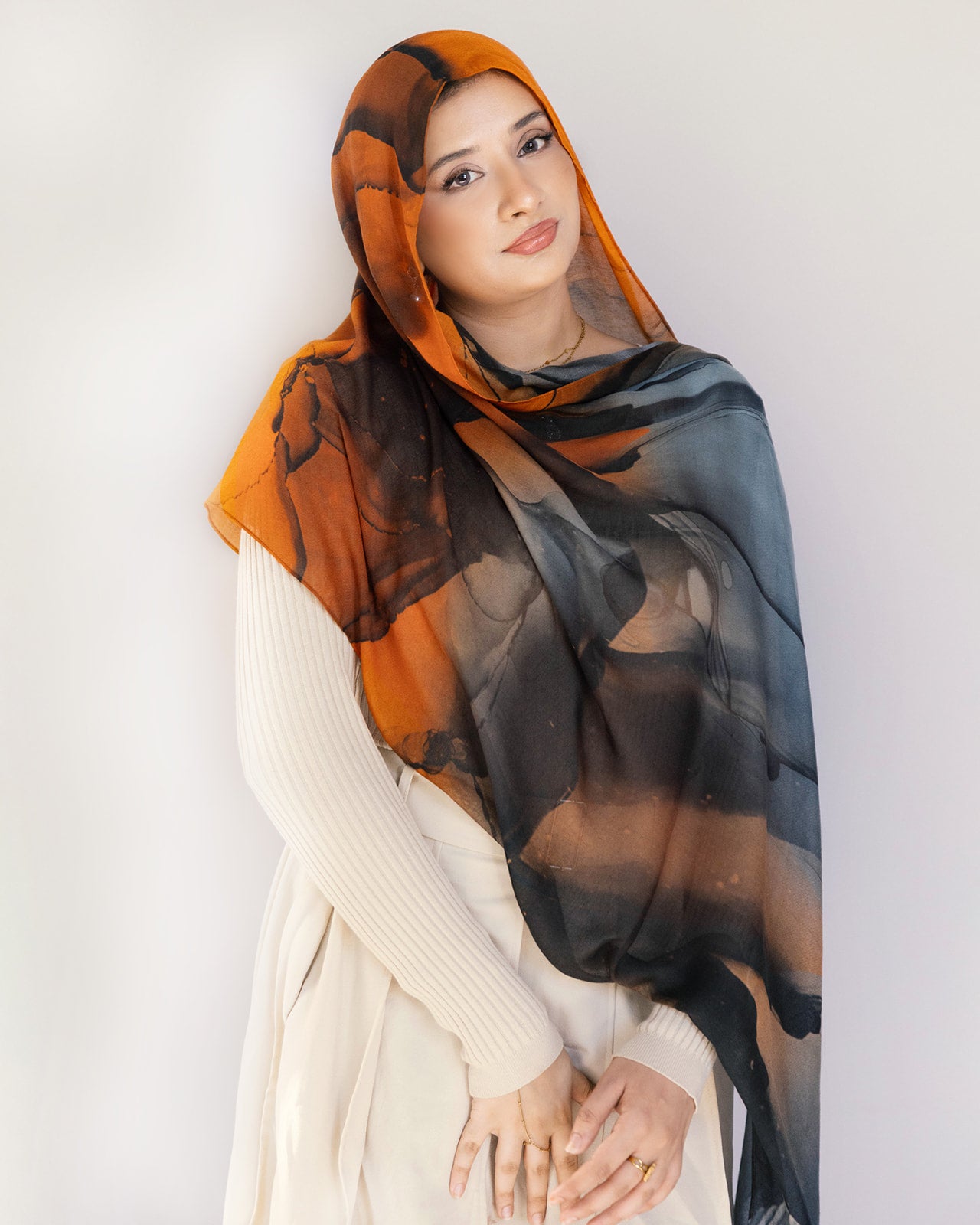 Molten Dusk embodies warmth with a modern edge crafted from ultra-soft modal fabric; it flows effortlessly while keeping you comfortable all day. Featuring a bold blend of burnt orange, charcoal black, and muted gray-blue tones, this hijab captures the drama of twilight skies, perfect for evenings, dinners, and standout moments.