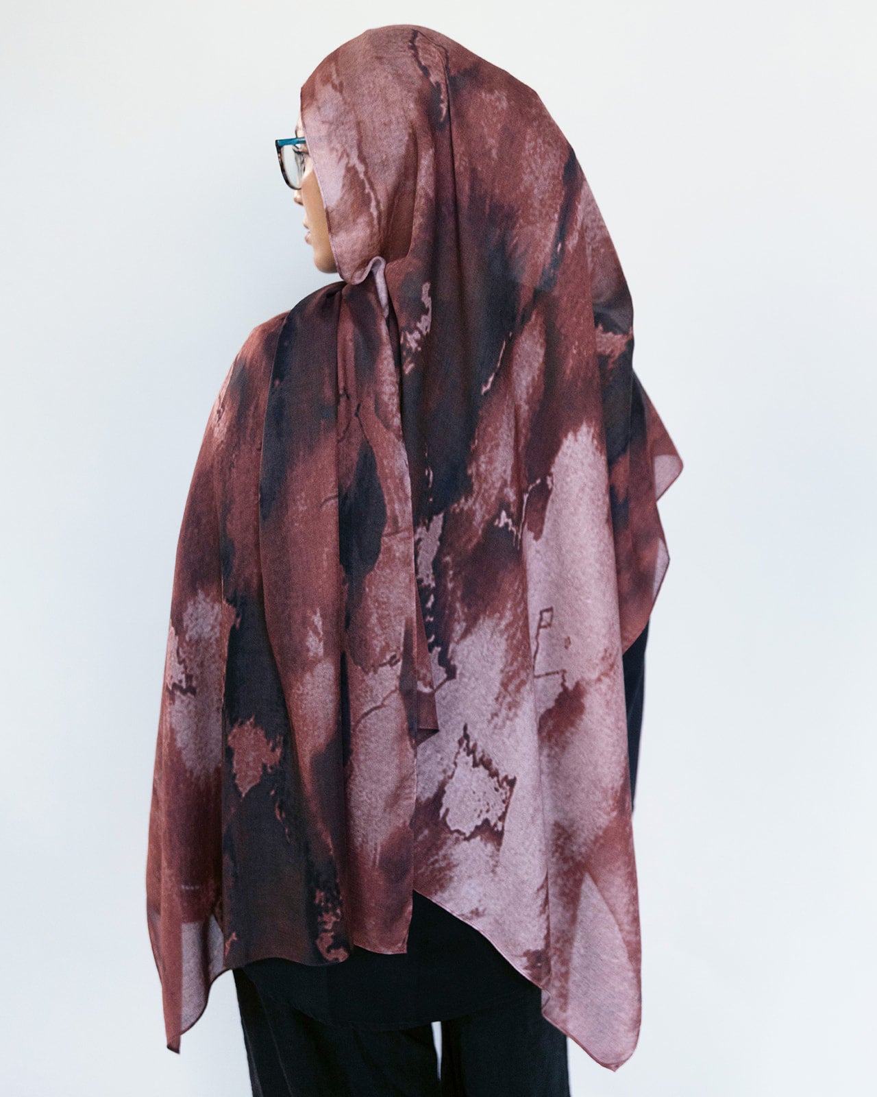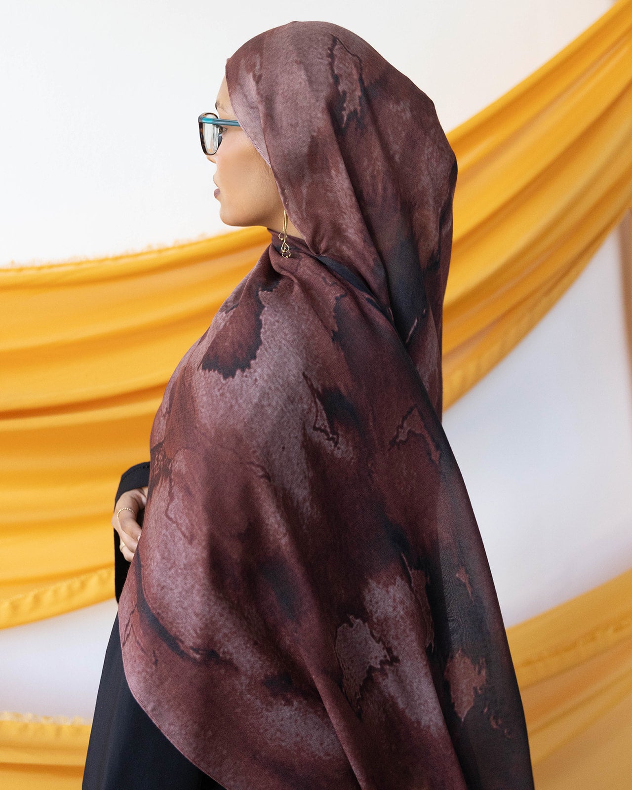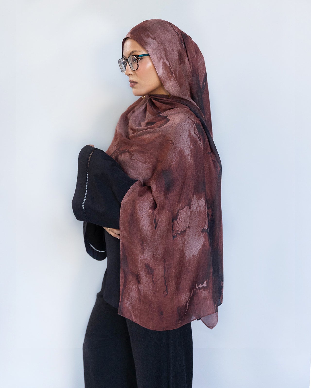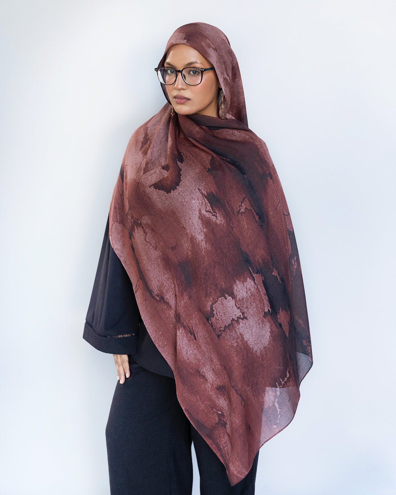 Terra Cotta captures earthy warmth and timeless elegance. Crafted from ultra-soft modal fabric, it offers a breathable drape that feels effortless all day. With its deep clay-brown and reddish undertones accented by subtle darker marbling, this hijab embodies natural sophistication. A versatile piece that elevates modest wear into everyday elegance, perfect for workdays, gatherings, or evening outings.